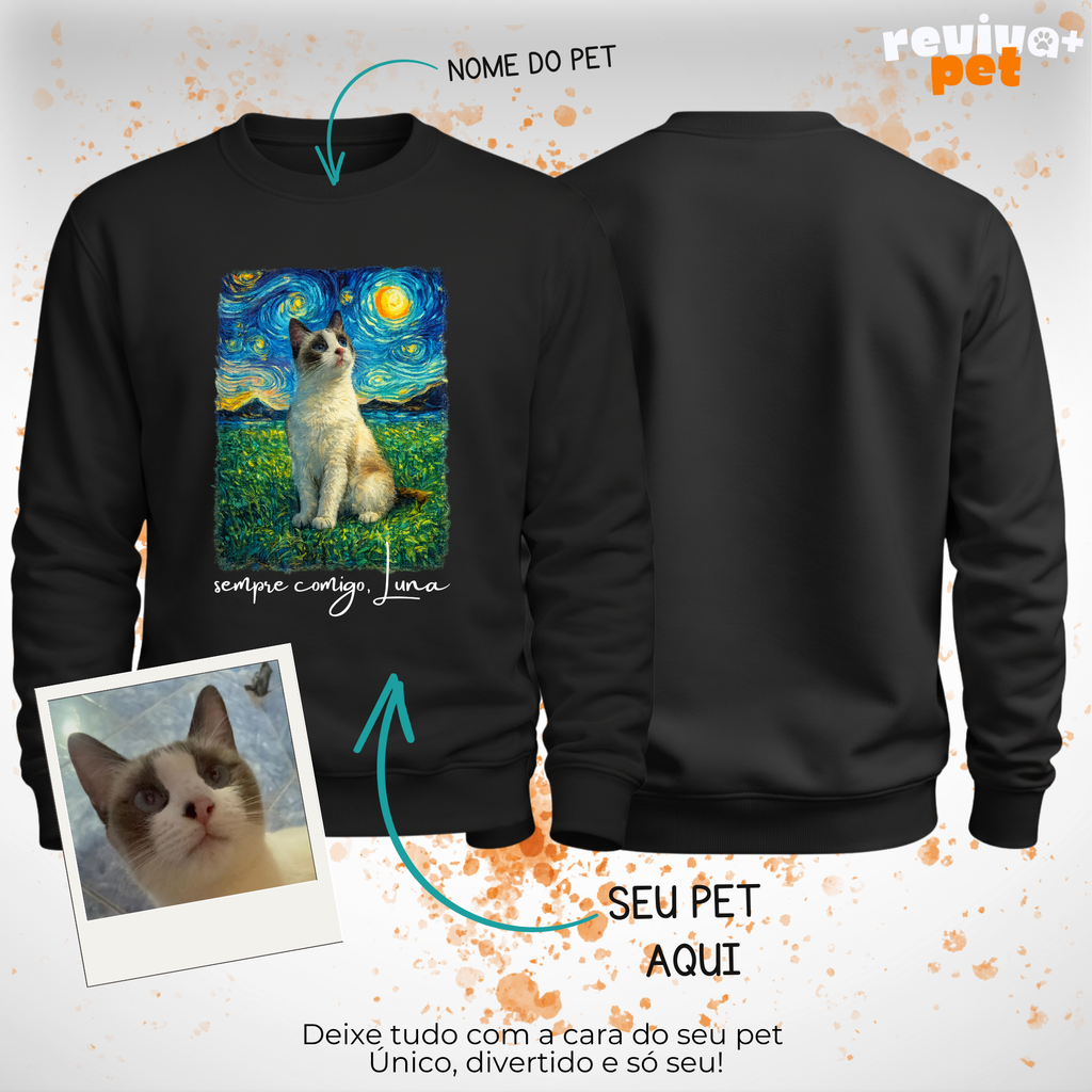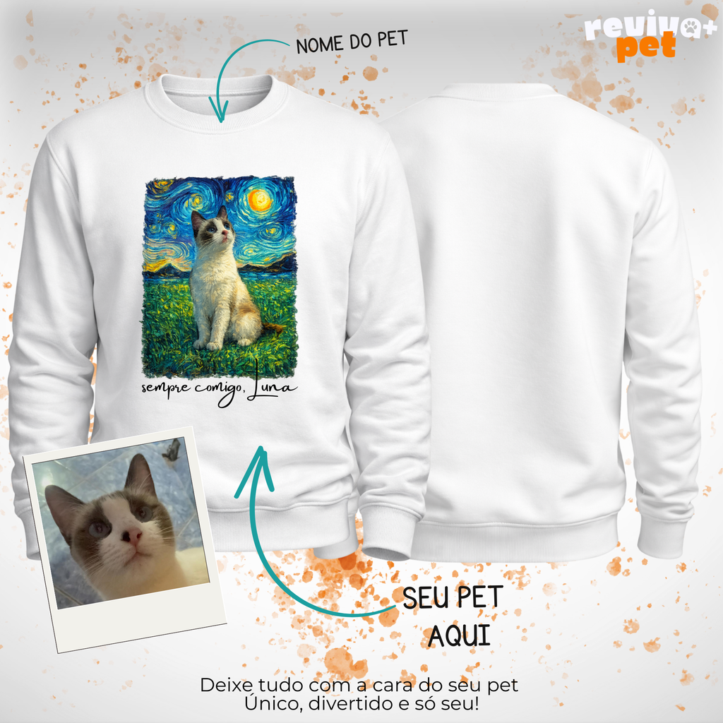 A estampa é aplicada na parte frontal do moletom, com dimensões aproximadas de 27 x 40 cm , garantindo destaque visual e protagonismo do seu pet no look.